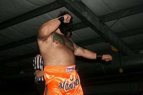 Shawn Murphy (MySpace page) appears to have a new wrestling persona and I completely approve with the new outfit. Gone is the singlet and in its place is those sexy orange kung fu shorts. Remember the real life dancing Kung Fu Panda from Chile? Here we have the ever-woofy Mr. Murphy dancing and wrestling as — get ready for it — King Kong Fu…